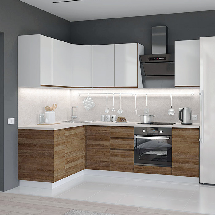 При производстве внимание уделено и общей природной стилистике, и мелким деталям. Подъемные механизмы, фурнитура, доводчики — они создают удобство при ежедневном использовании ящиков и различных отделений. В продаже также имеются декоративные панели, которые помогут закрыть технику или переход между модулями кухни.