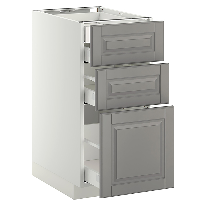 Модуль с 2 узкими и 1 широким ящиком отлично подойдет для кухонной утвари и столовых приборов. Актуально для скандинавского, минималистичного или хай-тек стилей кухни. Модуль имеет телескопические направляющие полного выдвижения.