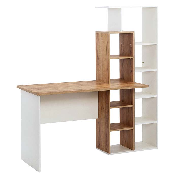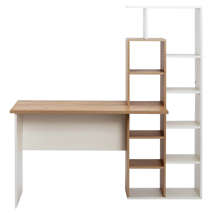 Многофункциональный рабочий стол отлично впишется в любой интерьер. Белый цвет притягивает взгляд и придает новый вид всей комнате. Можете поставить стол вдоль стены или сделать зонирование с помощью вертикальных стеллажей и мягкой мебели.